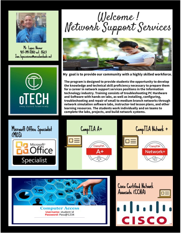 The program is designed to provide students the opportunity to develop the knowledge and technical skill proficiency necessary to prepare them for a career in network support services positions in the Information technology industry. Training consists of troubleshooting PC Hardware and Software with hands on labs, as well as installing, configuring, troubleshooting and repair of small to medium branch networks through network simulation software labs, instructor-led lesson plans, and other learning resources. The students work individually and on teams to complete the labs, projects, and build network systems.