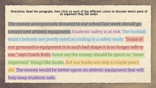 Directions: Read the paragraph, then click on each of the different colors to discover which parts of an argument they fall under.