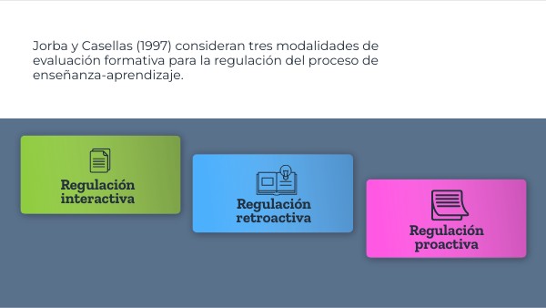 Jorba y Casellas (1997) consideran tres modalidades de evaluación formativa para la regulación del proceso de enseñanza-aprendizaje.