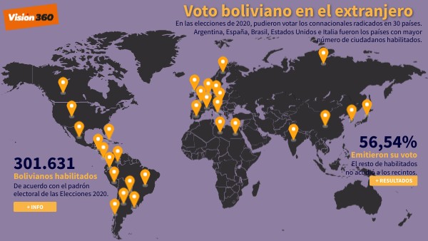 En las elecciones de 2020, del total de inscritos, 301.631 residentes bolivianos fueron habilitados para votar en 30 países, según datos del padrón electoral.