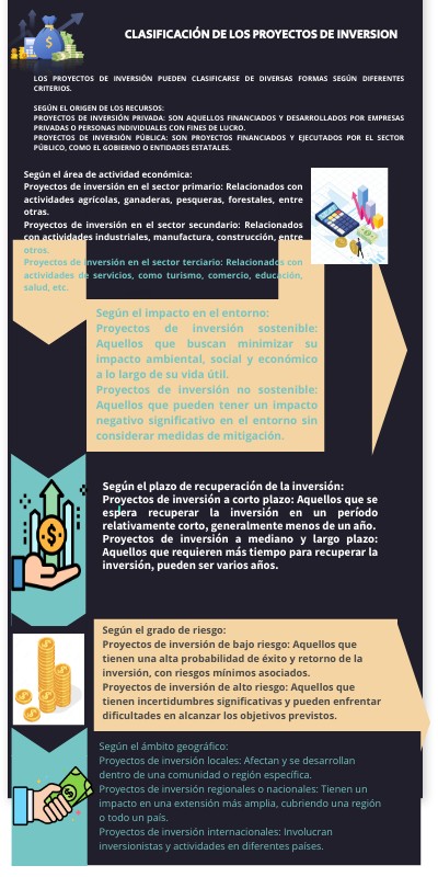 Según el impacto en el entorno: Proyectos de inversión sostenible: Aquellos que buscan minimizar su impacto ambiental, social y económico a lo largo de su vida útil. Proyectos de inversión no sostenible: Aquellos que pueden tener un impacto negativo significativo en el entorno sin considerar medidas de mitigación.