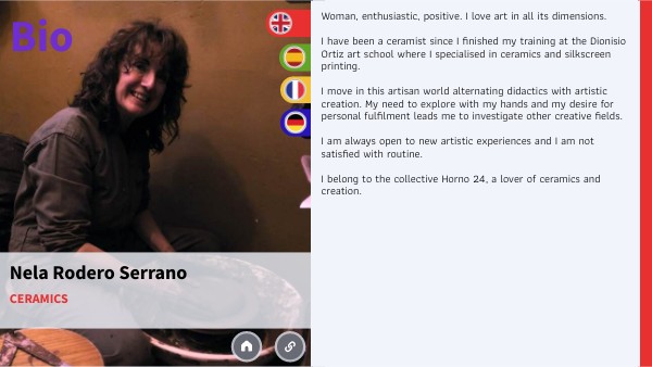Femme, enthousiaste, positive. J'aime l'art dans toutes ses dimensions. Je suis céramiste depuis que j'ai terminé ma formation à l'école d'art Dionisio Ortiz, où je me suis spécialisée dans la céramique et la sérigraphie. J'évolue dans ce monde artisanal en alternant didactique et création artistique. Mon besoin d'explorer avec mes mains et mon désir d'épanouissement personnel m'amènent à explorer d'autres domaines créatifs. Je suis toujours ouverte à de nouvelles expériences artistiques et je ne me contente pas de la routine. Je fais partie du collectif Horno 24, amoureux de la céramique et de la création.