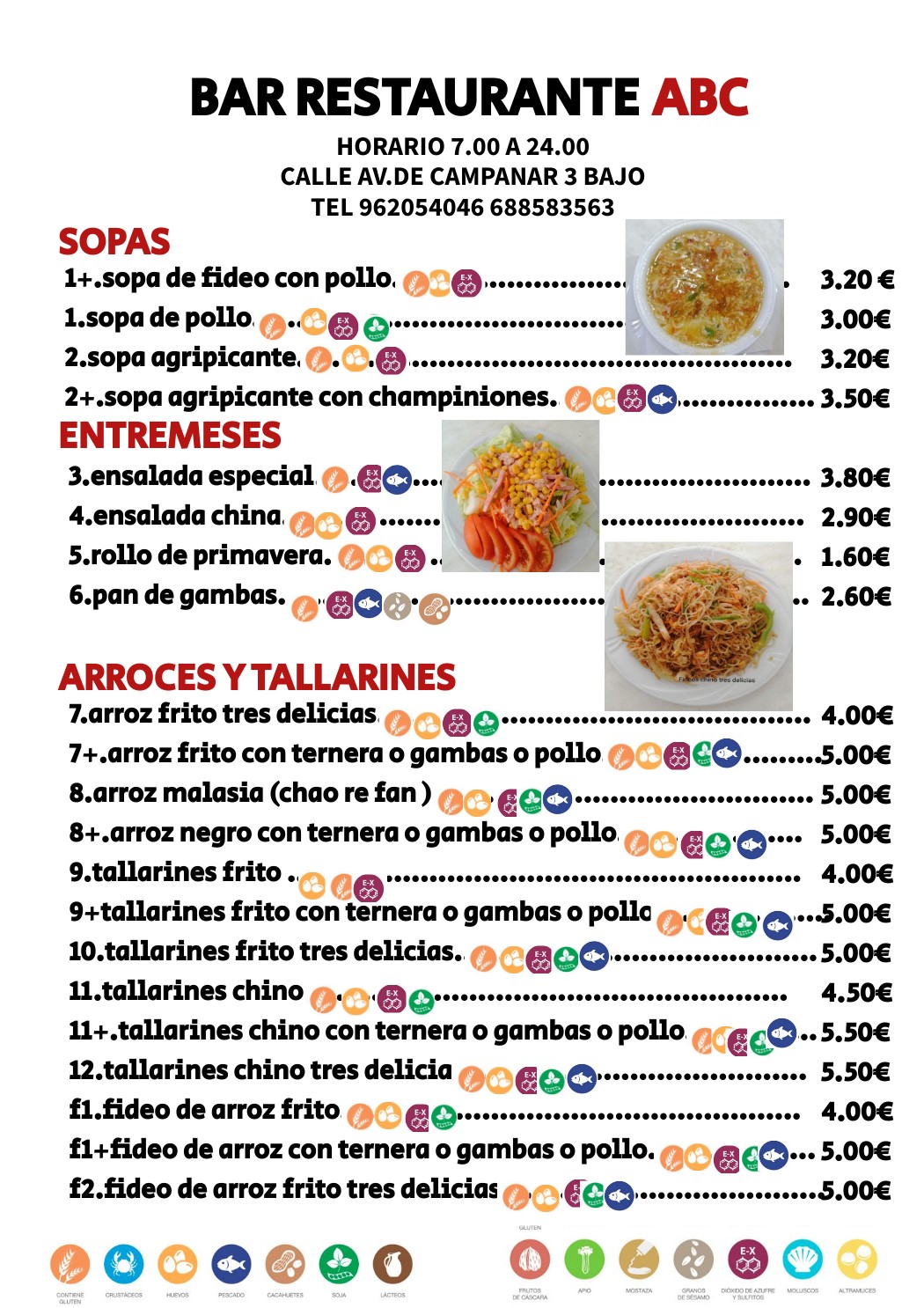 3.ensalada especial........................................................ 4.ensalada china........................................................... 5.rollo de primavera...................................................... 6.pan de gambas............................................................ 7.arroz frito tres delicias................................................. 7+.arroz frito con ternera o gambas o pollo......................... 8.arroz malasia (chao re fan )........................................... 8+.arroz negro con ternera o gambas o pollo..................... 9.tallarines frito .......................................................... 9+tallarines frito con ternera o gambas o pollo.................... 10.tallarines frito tres delicias......................................... 11.tallarines chino ...................................................... 11+.tallarines chino con ternera o gambas o pollo............... 12.tallarines chino tres delicias ...................................... f1.fideo de arroz frito.................................................... f1+fideo de arroz con ternera o gambas o pollo................... f2.fideo de arroz frito tres delicias ....................................
