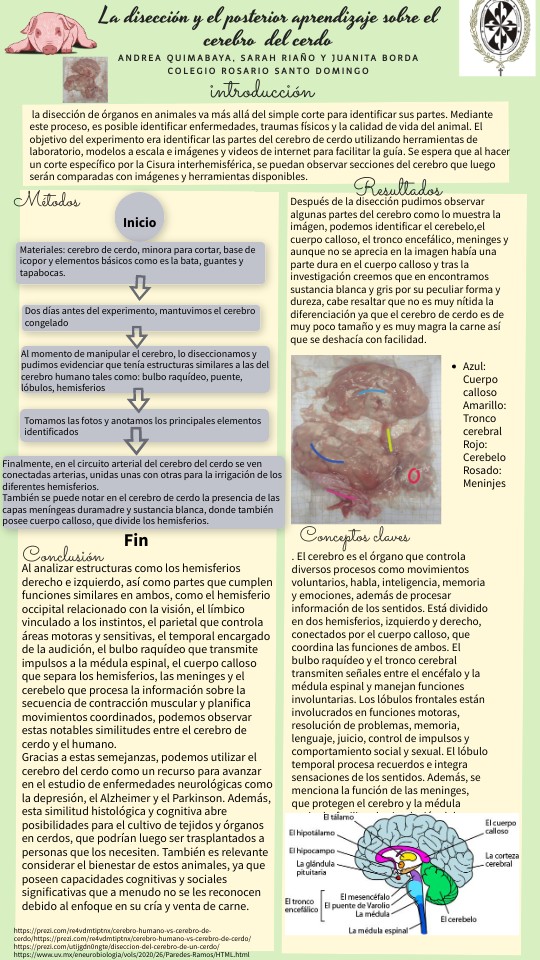 la disección de órganos en animales va más allá del simple corte para identificar sus partes. Mediante este proceso, es posible identificar enfermedades, traumas físicos y la calidad de vida del animal. El objetivo del experimento era identificar las partes del cerebro de cerdo utilizando herramientas de laboratorio, modelos a escala e imágenes y videos de internet para facilitar la guía. Se espera que al hacer un corte específico por la Cisura interhemisférica, se puedan observar secciones del cerebro que luego serán comparadas con imágenes y herramientas disponibles.