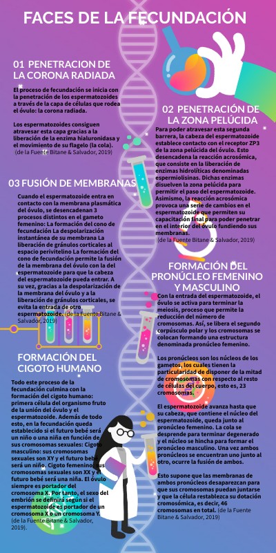 Todo este proceso de la fecundación culmina con la formación del cigoto humano: primera célula del organismo fruto de la unión del óvulo y el espermatozoide. Además de todo esto, en la fecundación queda establecido si el futuro bebé será un niño o una niña en función de sus cromosomas sexuales: Cigoto masculino: sus cromosomas sexuales son XY y el futuro bebé será un niño. Cigoto femenino: sus cromosomas sexuales son XX y el futuro bebé será una niña. El óvulo siempre es portador del cromosoma X. Por tanto, el sexo del embrión se definirá según si el espermatozoide es portador de un cromosoma X o un cromosoma Y. (de la Fuente Bitane & Salvador, 2019).