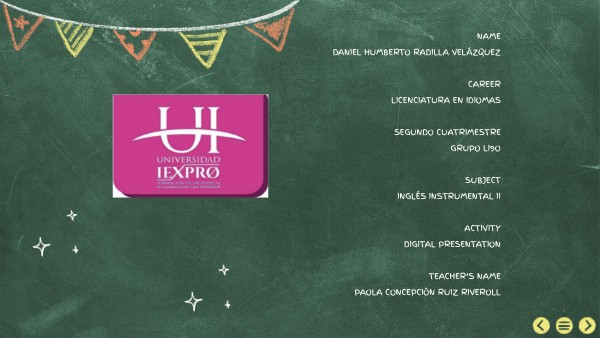 NAME DANIEL HUMBERTO RADILLA VELÁZQUEZ CAREER LICENCIATURA EN IDIOMAS SEGUNDO CUATRIMESTRE GRUPO LI9O SUBJECT INGLÉS INSTRUMENTAL II ACTIVITY DIGITAL PRESENTATION TEACHER’S NAME PAOLA CONCEPCIÓN RUIZ RIVEROLL
