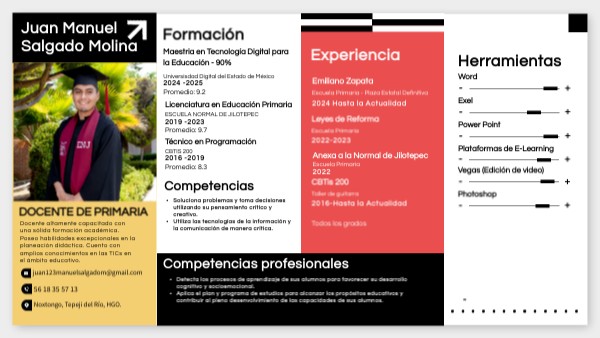 Docente altamente capacitado con una sólida formación académica. Poseo habilidades excepcionales en la planeación didáctica. Cuento con amplios conocimientos en las TICs en el ámbito educativo.