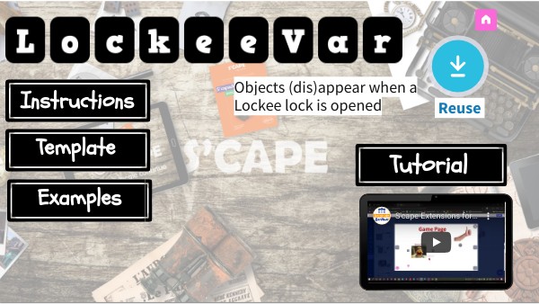You will need at least 3 pages. You need to decide on the name of your lock. In this example it is "lockeevar". Change the name that is grouped with the red, purple and green element. Make sure it is exacely the same and that the text is group with each element. 1. Title page: add the red element. When you test your lock, always start from the title page. 2. Game page: the page with the Lockee lock (see below how to set up). Add the purple elment. Add the OFF and/or ON element and group with a picture that you want to appear or dissappear when the lockee lock is opened. You can duplicate them to have several images appear/disappear. You can have the effect happen on a different page, in that case you need the purple element on the page with the effect. 3. Reward page: This page will be shown (as a smal window) instead of the lockee element, when the lock is opned. Add the black and the green element. Add the red element with "https://..." , go into preview mode and copy the link it shows - this is the link to this specific page. You can now delete the red link element.. Set up lockee: go to https://en.lockee.fr/ and sign in. Create your lock, you can use any type, but for the questions "When unlocked, displays:" you need to choose "a webpage". Paste the link you got from the reward page. When you lock is finished, copy the iFrame code. In Genial.ly, go to "insert" - "others" and paste the iFrame code and insert it into the game page.