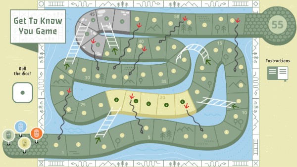 INSTRUCTIONS Each player starts with a token on the starting square. Players take turns rolling a single die to move their token by the number of squares indicated by the die roll. Tokens follow a fixed route marked on the gameboard from the bottom to the top of the playing area, passing once through every square. If, at the end of a move, a player's token lands at the bottom of a ladder, the player moves the token up the ladder to the top square. If the player lands on a snake's tail, the token must be moved down the snake to the bottom square. The player who is first to bring their token to the last square of the track is the winner. After a player reaches their square, they must answer the question hidden in the "i" on each square.