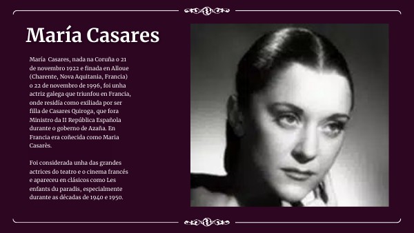 María Casares, nada na Coruña o 21 de novembro 1922 e finada en Alloue (Charente, Nova Aquitania, Francia) o 22 de novembro de 1996, foi unha actriz galega que triunfou en Francia, onde residía como exiliada por ser filla de Casares Quiroga, que fora Ministro da II República Española durante o goberno de Azaña. En Francia era coñecida como Maria Casarès. Foi considerada unha das grandes actrices do teatro e o cinema francés e apareceu en clásicos como Les enfants du paradis, especialmente durante as décadas de 1940 e 1950.