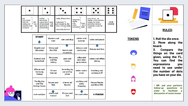 1. Roll the die once. 2. Move along the board. 3. Compare the things on the card given, using the FL. You can find the expressions you need to use under the number of dots you have on your die.