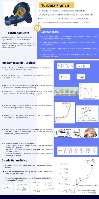 Tipo de turbina de reacción que utiliza agua como fluido de trabajo. Turbina de flujo mixto: el fluido entra radialmente y sale axialmente del rotor. Nombre dado en honor a James B. Francis, quien la desarrolló en 1848. Ampliamente utilizada en centrales hidroeléctricas debido a su versatilidad.
