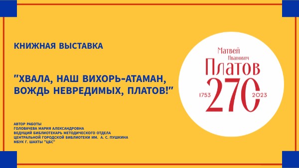 Это выставка посвящена нашему великому земляку, который смог пройти путь от урядника до атамана Войска Донского и генерала от кавалерии. Участвовал во всех сражениях, которые были в истории России за период его службы. Имел множество наград, в том числе и иностранных. Его уважали казаки и вся Россия, боялись французы и восхищались англичане. Его личность окутана тайнами и легендами. Дата рождения, отношения с императорами (и не только с русскими), его ссылка в Кострому и заключение в Петропавловскую крепость - всё это и многое другое вы найдётё на страницах книг и журналов наших библиотек.