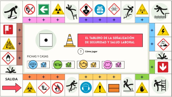 Cada grupo de jugadores debe elegir un color: azul, verde, amarillo o rosa. Así obtiene una ficha para marcar su posición y 10 casas para indicar las propiedades que adquiere a lo largo del juego. Cada jugador debe coger la ficha de su color y colocarla en la casilla de salida. Para empezar a jugar, pincha sobre el dado y mueve tu ficha hasta la casilla que corresponda. En cada casilla hay una pregunta consistente en identificar la señal o pictograma que en ella se representa. Si la aciertas, coloca una de tus casas en dicha casilla. ¡Enhorabuena, has conseguido una nueva propiedad! Casillas con iconos de caídas: suponen que el equipo debe proponer una medida de prevención y una medida de protección contra uno de los riesgos en los que tenga una casa. Acierta la pregunta o perderás una casa. Ganará aquel grupo de jugadores que tenga el mayor número de casas sobre el tablero una vez que todas las casillas estén ocupadas.