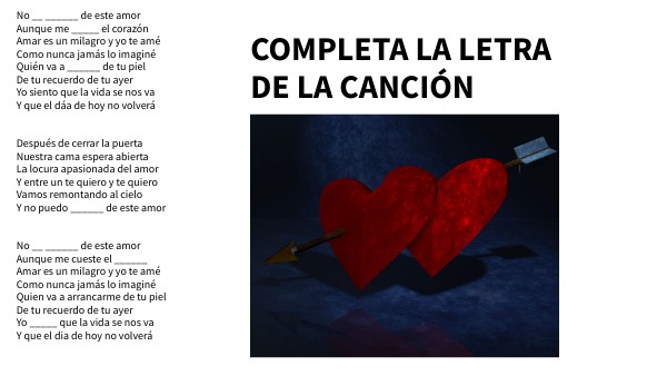 No __ ______ de este amor Aunque me _____ el corazón Amar es un milagro y yo te amé Como nunca jamás lo imaginé Quién va a ______ de tu piel De tu recuerdo de tu ayer Yo siento que la vida se nos va Y que el dáa de hoy no volverá Después de cerrar la puerta Nuestra cama espera abierta La locura apasionada del amor Y entre un te quiero y te quiero Vamos remontando al cielo Y no puedo ______ de este amor No __ ______ de este amor Aunque me cueste el ______ Amar es un milagro y yo te amé Como nunca jamás lo imaginé Quien va a arrancarme de tu piel De tu recuerdo de tu ayer Yo _____ que la vida se nos va Y que el dia de hoy no volverá
