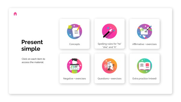 For he, she, and it, we add +s to the verb. Example: She likes pizza.