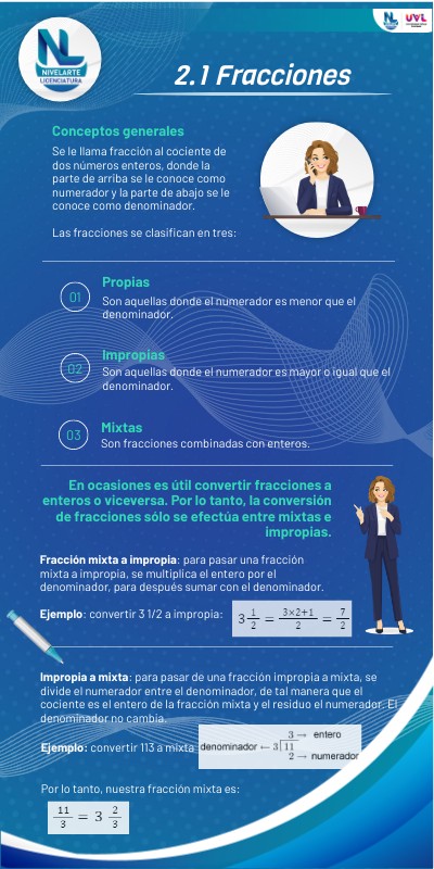 Impropia a mixta: para pasar de una fracción impropia a mixta, se divide el numerador entre el denominador, de tal manera que el cociente es el entero de la fracción mixta y el residuo el numerador. El denominador no cambia.