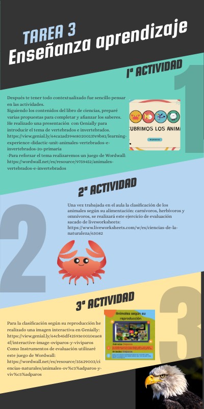 Después te tener todo contextualizado fue sencillo pensar en las actividades. Siguiendo los contenidos del libro de ciencias, preparé varias propuestas para completar y afianzar los saberes. He realizado una presentación con Genially para introducir el tema de vertebrados e invertebrados. https://view.genial.ly/64ca1ad394e80200137e9b81/learning-experience-didactic-unit-animales-vertebrados-e-invertebrados-2o-primaria -Para reforzar el tema realizaremos un juego de Wordwall: https://wordwall.net/es/resource/9759452/animales-vertebrados-e-invertebrados