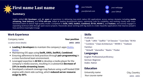Highly skilled iOS Developer with 4+ years of experience in delivering top-notch native iOS applications across various domains including media streaming, food delivery, and FTTH self-care. Adept at leading development teams, optimizing code for scalability, and working closely with cross-functional teams to deliver high-quality results. Competent in Swift, UIKit, SwiftUI, Combined, AV Kit, MVVM-C, and Fastlane, and actively engaged in expanding technical skills through open-source projects. Passionate about working with big teams to create impactful applications that improve people's lives and drive meaningful change.