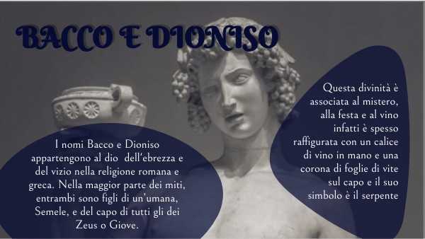 I nomi Bacco e Dioniso appartengono al dio dell'ebrezza e del vizio nella religione romana e greca. Nella maggior parte dei miti, entrambi sono figli di un’umana, Semele, e del capo di tutti gli dei Zeus o Giove.