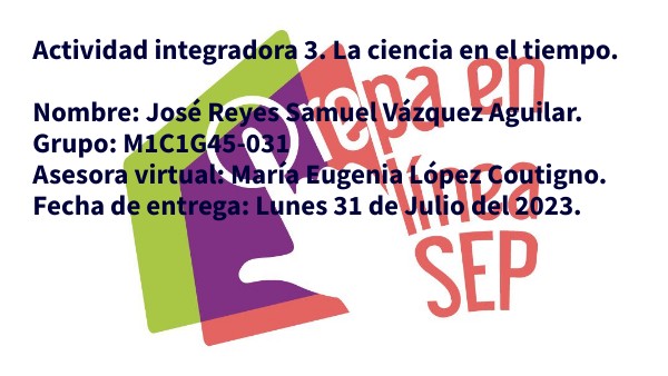 Actividad integradora 3. La ciencia en el tiempo.Nombre: José Reyes Samuel Vázquez Aguilar. Grupo: M1C1G45-031 Asesora virtual: María Eugenia López Coutigno. Fecha de entrega: Lunes 31 de Julio del 2023.