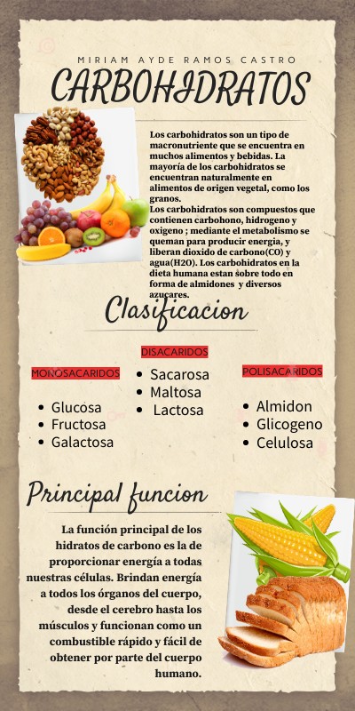 Los carbohidratos son un tipo de macronutriente que se encuentra en muchos alimentos y bebidas. La mayoría de los carbohidratos se encuentran naturalmente en alimentos de origen vegetal, como los granos. Los carbohidratos son compuestos que contienen carbohono, hidrogeno y oxigeno ; mediante el metabolismo se queman para producir energia, y liberan dioxido de carbono(CO) y agua(H2O). Los carbohidratos en la dieta humana estan sobre todo en forma de almidones y diversos azucares.