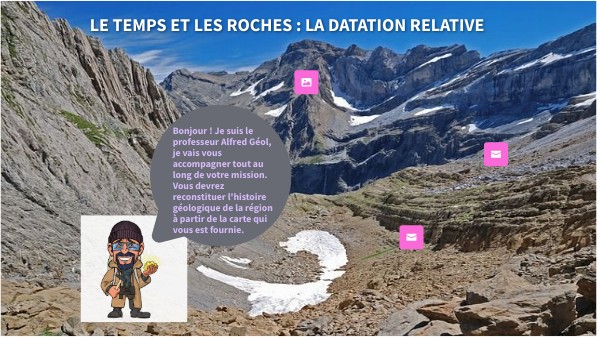 Bonjour ! Je suis le professeur Alfred Géol, je vais vous accompagner tout au long de votre mission. Vous devrez reconstituer l'histoire géologique de la région à partir de la carte qui vous est fournie.