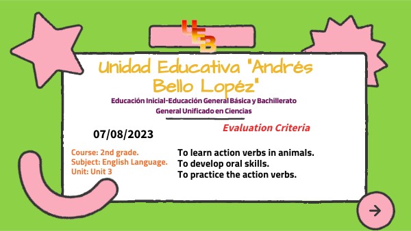 To learn action verbs in animals. To develop oral skills. To practice the action verbs.