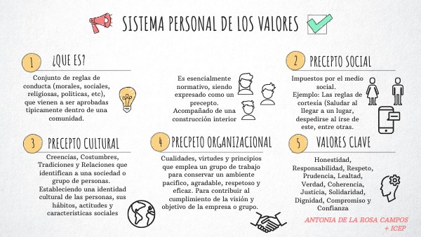 Honestidad, Responsabilidad, Respeto, Prudencia, Lealtad, Verdad, Coherencia, Justicia, Solidaridad, Dignidad, Compromiso y Confianza