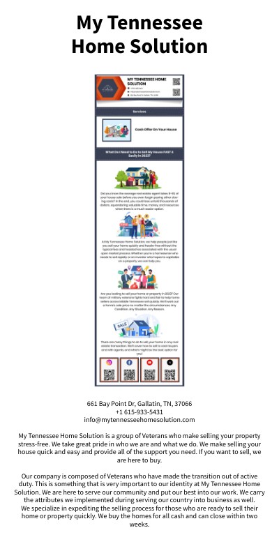661 Bay Point Dr, Gallatin, TN, 37066 +1 615-933-5431 info@mytennesseehomesolution.com My Tennessee Home Solution is a group of Veterans who make selling your property stress-free. We take great pride in who we are and what we do. We make selling your house quick and easy and provide all of the support you need. If you want to sell, we are here to buy. Our company is composed of Veterans who have made the transition out of active duty. This is something that is very important to our identity at My Tennessee Home Solution. We are here to serve our community and put our best into our work. We carry the attributes we implemented during serving our country into business as well. We specialize in expediting the selling process for those who are ready to sell their home or property quickly. We buy the homes for all cash and can close within two weeks.