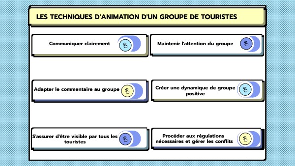 - Eviter de parler d'un ton monotone ou de lire ses fiches, n'utiliser ses notes que comme aide-mémoire. - Maitriser sa gestuelle : gestes dynamiques, posture droite. - Varier les éléments utilisés : humour, légendes, histoires, anecdotes personnelles... - Improviser : agrémenter le commentaire en fonction des observations faites dans le groupe. - Interagir avec le groupe : poser des questions, permettre aux touristes de participer et de faire des commentaires, faire écouter des musiques typiques ou montrer des vidéos, organiser un jeu/quiz/concours, dégustations...)