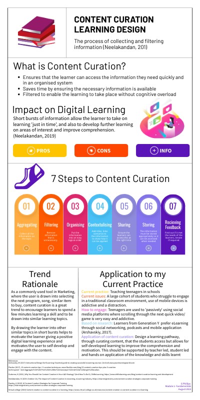 Current practice: Teaching teenagers in schools Current issues: A large cohort of students who struggle to engage in a traditional classroom environment, use of mobile devices is addictive and a distraction. How to engage: Teenagers are used to 'passively' using social media platforms where scrolling through the next quick video/ game is very easy and addictive. Based on research: Learners from Generation Y prefer eLearning through social networking, podcasts and mobile application (Arshavskiy, 2017). Application of content curation: Design a learning pathway, through curating content, that the students access but allows for self-developed learning to improve the comprehension and motivation. This should be supported by teacher led, student led and hands on application of the knowledge and skills learnt