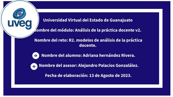 Universidad Virtual del Estado de Guanajuato Nombre del módulo: Análisis de la práctica docente v2. Nombre del reto: R2. modelos de análisis de la práctica docente. Nombre del alumno: Adriana hernández Rivera. Nombre del asesor: Alejandro Palacios Gonzalález. Fecha de elaboración: 13 de Agosto de 2023.