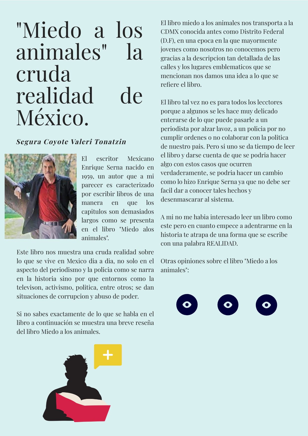 El escritor Mexicano Enrique Serna nacido en 1959, un autor que a mi parecer es caracterizado por escribir libros de una manera en que los capitulos son demasiados largos como se presenta en el libro "Miedo alos animales".