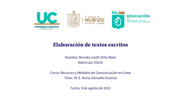 Nombre: Brenda Lizeth Ortiz Mota Matrícula: 59124 Curso: Recursos y Métodos de Comunicación en Línea Tutor: M. E. Nuria Zamudio Escorza Fecha: 9 de agosto de 2023