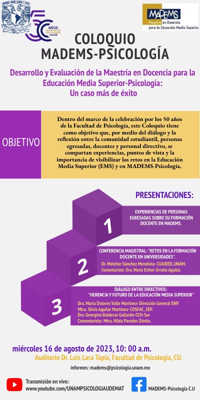 Dentro del marco de la celebración por los 50 años de la Facultad de Psicología, este Coloquio tiene como objetivo que, por medio del diálogo y la reflexión entre la comunidad estudiantil, personas egresadas, docentes y personal directivo, se compartan experiencias, puntos de vista y la importancia de visibilizar los retos en la Educación Media Superior (EMS) y en MADEMS-Psicología.
