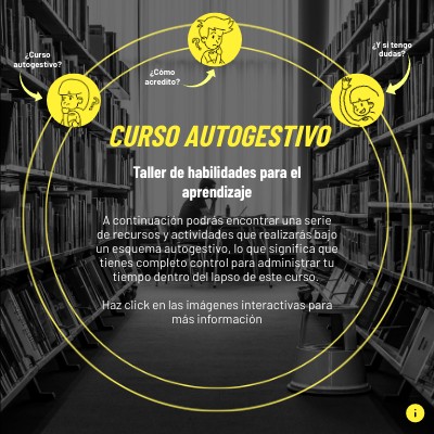 A continuación podrás encontrar una serie de recursos y actividades que realizarás bajo un esquema autogestivo, lo que significa que tienes completo control para administrar tu tiempo dentro del lapso de este curso. Haz click en las imágenes interactivas para más información