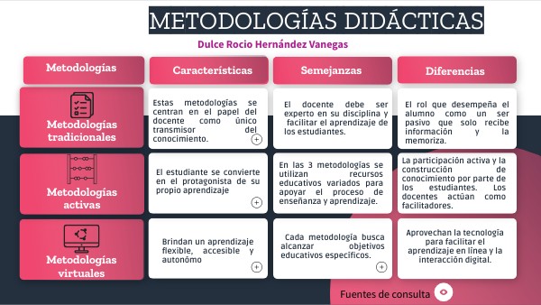 Referencias:Lizardi A. (s.f). L5. Metodologías tradicionales y sus características. Universidad Virtual del Estado de Guanajuato. Lizardi A. (s.f). L6. Metodologías activas y sus características. Universidad Virtual del Estado de Guanajuato. Lizardi A. (s.f). L7. Metodologías de la educación virtual y sus características. Universidad Virtual del Estado de Guanajuato.