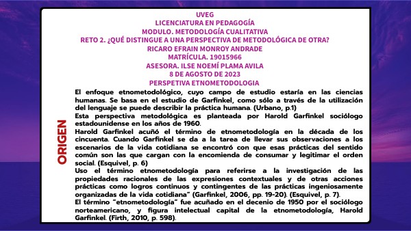 UVEGLICENCIATURA EN PEDAGOGÍA MODULO. METODOLOGÍA CUALITATIVA RETO 2. ¿QUÉ DISTINGUE A UNA PERSPECTIVA DE METODOLÓGICA DE OTRA? RICARO EFRAIN MONROY ANDRADE MATRÍCULA. 19015966 ASESORA. ILSE NOEMÍ PLAMA AVILA 8 DE AGOSTO DE 2023 PERSPETIVA ETNOMETODOLOGIA