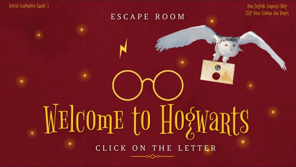 Queridos alumnos e alumnas, Parabéns! Benvidos ao Colexio Hogwarts de Maxía e Feiticería Antes de ir a estación de King's Cross, teredes que ir ao canellón Diagon para mercar os libros e o equipamento nesecario. Para poder entrar, teredes que demostrar como de bos sodes en inglés e atopar o código que vos permita abrir a parede de ladrillos. Para acceder as probas teredes que empregar uns gorros enfeitizados que vos levarán a cada unha delas. Boa sorte neste curso máxico que ides empezar!