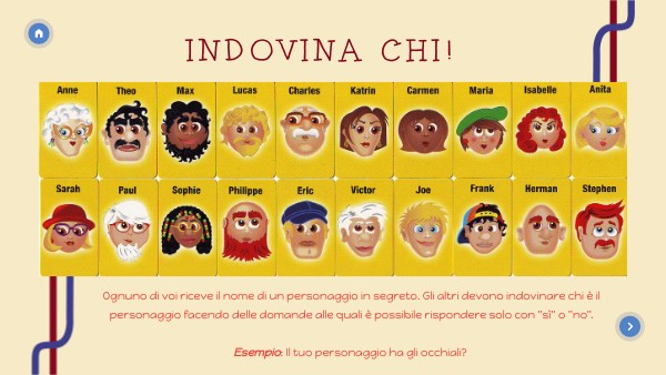 Ognuno di voi riceve il nome di un personaggio in segreto. Gli altri devono indovinare chi è il personaggio facendo delle domande alle quali è possibile rispondere solo con "sì" o "no". Esempio: Il tuo personaggio ha gli occhiali?