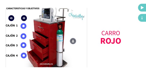 Bolsas para reanimación, catéter para oxígeno, soluciones endovenosas. El carro rojo es una unidad constituida por un mueble con ruedas para desplazar, con espacio suficiente para colocar un desfibrilador portátil.