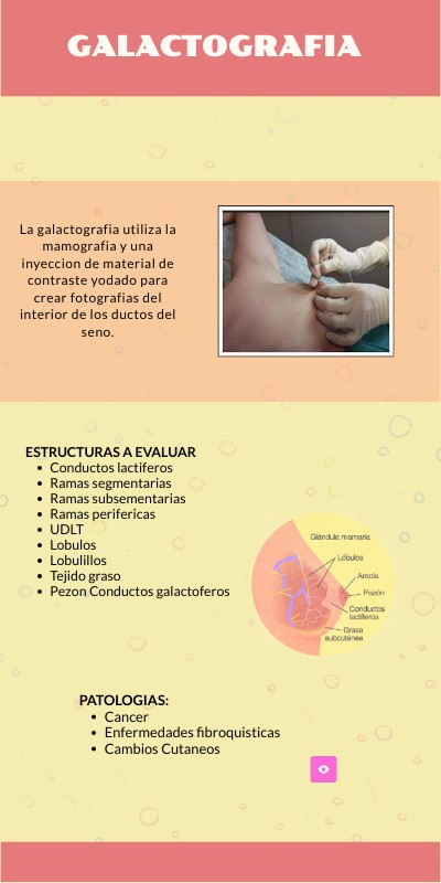 La galactografia utiliza la mamografia y una inyeccion de material de contraste yodado para crear fotografias del interior de los ductos del seno.