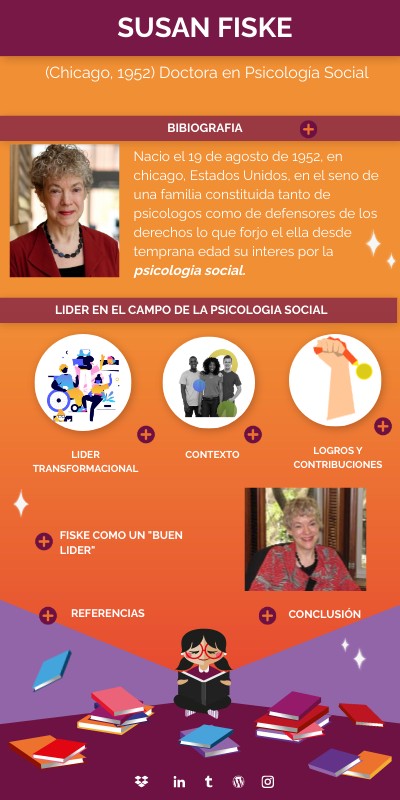 -Chacón, R., del Río Urrutia, X., Pérez Sánchez, R., & Smith-Castro, V. (2017). Aportes de la psicología cognitiva a la comprensión del fenómeno perceptual de deshumanización. Revista Interamericana de Psicología/Interamerican Journal of Psychology, 51(1),60-69. Recuperado el 10 de agosto del 2023, de: https://www.redalyc.org/articulo.oa?id=28452860006 -Diaz, A., (15 de abril de 2020). Dos pioneras en unir el cerebro a la cultura. El mundo. Recuperado el 10 de agosto de 2023 de https://www.elmundo.es/ciencia-y-salud/ciencia/2020/04/15/5e97541c21efa0b2648b45ab.html -Durante, F., Volpato, C., & Fiske, S. T. (2010). Using the Stereotype Content Model to examine group depictions in Fascism: An Archival Approach. European journal of social psychology, 40(3), 10.1002/ejsp.637. https://doi.org/10.1002/ejsp.637 -Fundación BBVA (15 de abril de 2020). Susan Fiske. Premio fronteras del conocimiento.Recuperado el 11 de agosto de 2023 de https://www.premiosfronterasdelconocimiento.es/galardonados/susan-fiske/ -Lemos, R., (13 de mayo de 2022). Susan Fiske: biografía de una psicóloga que aborda el sexismo y los prejuicios. La mente es maravillosa. Recuperado el 10 de agosto de 2023 de: https://lamenteesmaravillosa.com/susan-fiske-biografia-psicologa-aborda-sexismo-prejuicios/ - Luna-Bernal, Alejandro César Antonio, & Laca-Arocena, Francisco Augusto. (2017). Sexismo ambivalente y estilos de manejo de conflictos en estudiantes de bachillerato. RIDE. Revista Iberoamericana para la Investigación y el Desarrollo Educativo, 8(15), 182-209. https://doi.org/10.23913/ride.v8i15.296 -Montagud, N., (18 de noviembre de 2019). Susan Fiske: biografía de esta psicóloga social. Psicología y mente. Recuperado el 11 de agosto de 2023 de https://psicologiaymente.com/biografias/susan-fiske - Ojeda, E., (8 de febrero del 2023). Top 10 Psicólogos Contemporáneos más influyentes [Mensaje en blog]. Recuperado el 08 de agosto de 2023, de https://neopraxis.mx/top-10-psicologos-contemporaneos-mas-influyentes/ -Rodríguez-Bailón, R., Moya, M., & Yzerbyt, V. (2006). Cuando el poder ostentado es inmerecido: sus efectos sobre la percepción y los juicios sociales. Psicothema, 18(2),194-199.[fecha de Consulta 15 de Agosto de 2023]. ISSN: 0214-9915. Recuperado de: https://www.redalyc.org/articulo.oa?id=72718205