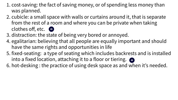 7. noise level: measurement on the intensity of the sound.8. open office 9. partitions: a wall or screen that separates one area from another A thin partition separates the two rooms in the cabin.10. privacy: someone's right to keep their personal matters and relationships secret.11. spacious: large and with a lot of space. 12. team work: the combined action of a group, especially when effective and efficient.13. trendy: very fashionable or up to date.