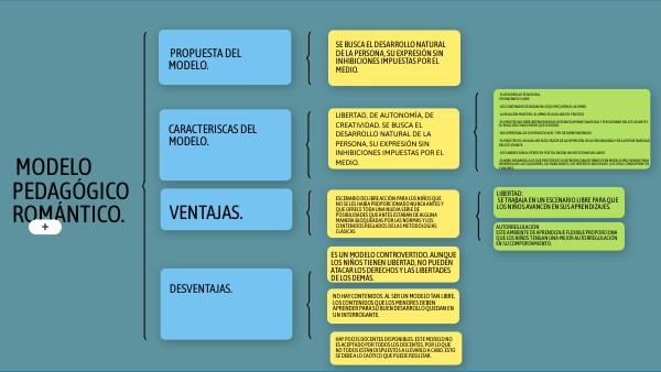· El desarrollo es natural, espontáneo y libre · Los contenidos se basan en lo que requiera el alumno · La relación maestro- alumno es auxiliar del proceso · El maestro no debe intervenir en el desenvolvimiento natural y espontáneo del estudiante y su relación con el medio que le rodea. · No interesan los contenidos ni el tipo de saber enseñado · El maestro es un auxiliar facilitador de la expresión, de la originalidad y de la espontaneidad del estudiante. · Los saberes son auténticos por tal razón, no necesitan evaluarse · El niño desarrolla lo que procede de su interior convirtiéndose en modelo más flexible para desarrollar las cualidades, las habilidades, sus intereses naturales, sus ideas, conocimientos y valores.