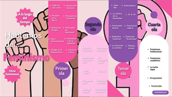 EcuRed. (s.f.). Théroige de Méricourt. EcuRed. https://www.ecured.cu/Th%C3%A9roigne_de_M%C3%A9ricourt Espinosa Núñez, I. (s.f.). La larga lucha del feminismo. https://www.legisver.gob.mx/equidadNotas/publicacionLXIII/Isabel%20Espinosa%20-%20La%20larga%20lucha%20del%20feminismo.pdf de Miguel, A. (2000). Los feminismos. Verbo Divino. https://www.legisver.gob.mx/equidadNotas/publicacionLXIII/Ana%20de%20Miguel%20-%20Los%20feminismos.pdf Marimar. (29 de julio de 2023). La ilustración, siglo de las luces: características, representantes y fotos. SOBREHISTORIA.COM by TENDENZIAS. https://sobrehistoria.com/la-ilustracion/ Mejía, V. (s.f.). Kate Millet, feminista radical. Coordinación para la igualdad de Género UNAM. https://coordinaciongenero.unam.mx/2021/09/kate-millet-feminista-radical/ Suárez Álvarez, B., Ramírez Dávila, A. y García Jane, O. E. (2022). El feminismo a lo largo de la historia. Universidad Virtual del Estado de Guanajuato. https://drive.google.com/file/d/1OpQGJl51_DmEvgCpgjskHDm43Z4Nq1yH/view UVEG Académico. (2022). Feminismo para principiantes. [Vídeo]. Youtube. https://youtu.be/rxyMPvomELM