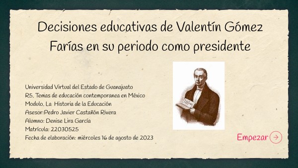 Universidad Virtual del Estado de Guanajuato R5. Temas de educación contemporanea en México Modulo. La Historia de la Educación Asesor:Pedro Javier Castañón Rivera Alumno: Denise Lira García Matrícula: 22030525 Fecha de elaboración: miércoles 16 de agosto de 2023