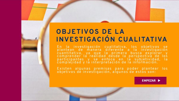 En la investigación cualitativa, los objetivos se plantean de manera diferente a la investigación cuantitativa, ya que la primera busca explorar y comprender la realidad desde la perspectiva de los participantes y se enfoca en la subjetividad, la complejidad y la interpretación de la información. Existen algunas premisas para poder plantear los objetivos de investigación, algunos de estos son: