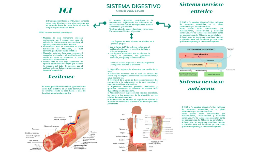El tracto gastrointestinal (TGI), igual conocido como tubo diestivo, es un tubo continuo que se extiende desde la boca hasta el ano. Su longitud aproximada es de 9m.